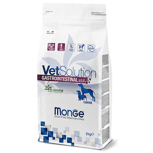 Monge VetSolution Gastrointestinal Canino Adulto es un alimento dietético completo para perros formulado para la reducción de los trastornos de absorción intestinal. Contiene jugo de melón concetrato para neutralizar los radicales libres, castaño de indias para el apoyo intestinal, xilo-oligosacáridos (XOS) para asegurar la microbiota intestinal. Alimento altamente digestible con aumento de sodio y potasio.